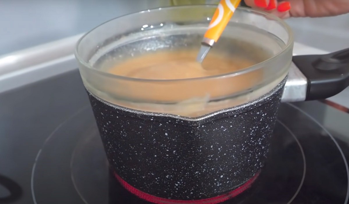 Postaw garnek z wodą na ogniu i podgrzej składniki w kąpieli wodnej, mieszając, aż żelatyna całkowicie się rozpuści.