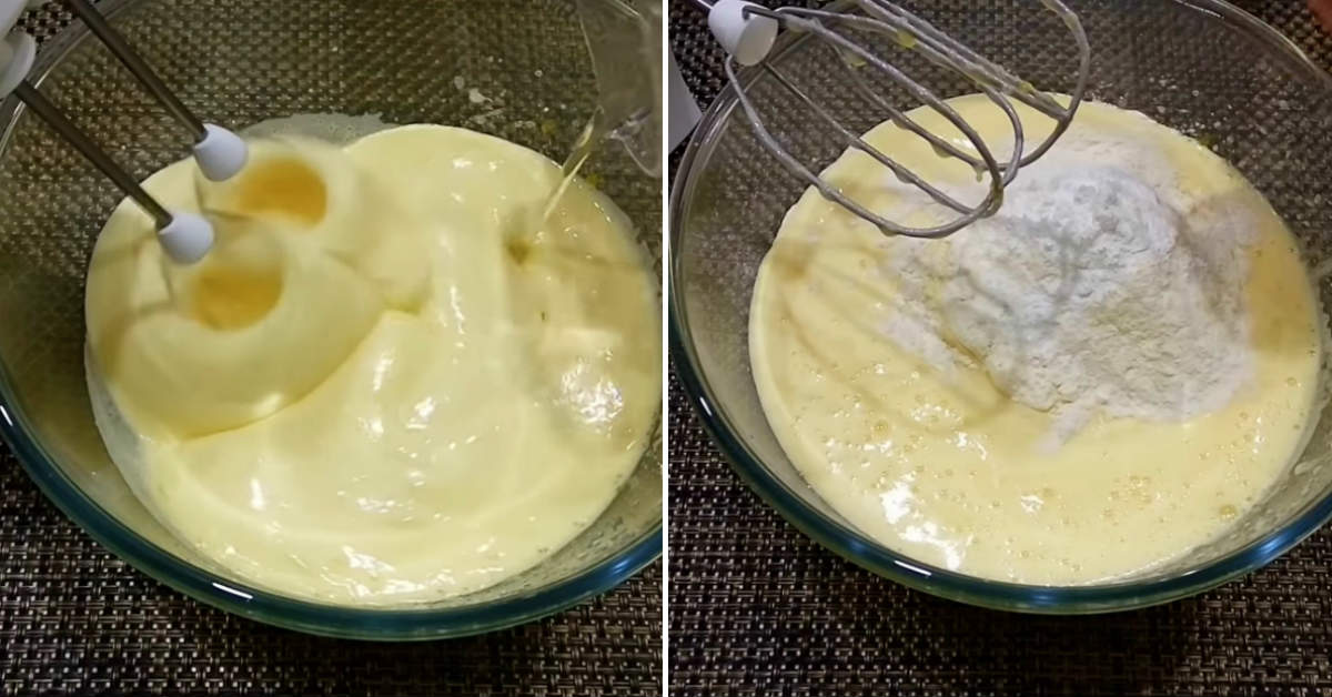 Rozpocznij od przygotowania ciasta. Jajka wbij do głębokiej miski, posyp cukrem i ubij trzepaczką. Dodaj roztopione masło i szczyptę soli, a następnie ponownie wymieszaj. Do mieszanki wlej śmietanę i wanilinę, mieszając do uzyskania jednolitej masy. Mąkę połącz z proszkiem do pieczenia i przesiej do płynnej masy, zagniatając jednolite ciasto.