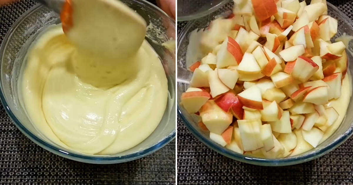 Jabłka obierz, wydrąż i pokrój na kliny lub kostki. Dodaj je do ciasta, mieszając dokładnie. Formę do pieczenia wyłóż pergaminem, wylej na nią ciasto i równomiernie rozprowadź.