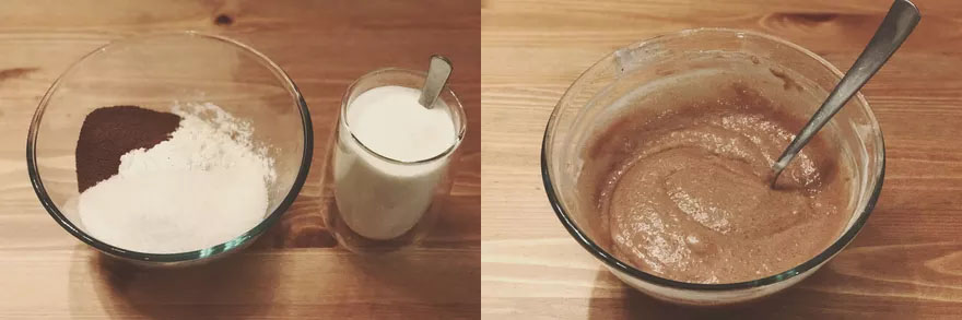 Do miski wlej kefir, następnie dodaj mąkę, cukier i kakao. Dobrze wymieszaj wszystko.