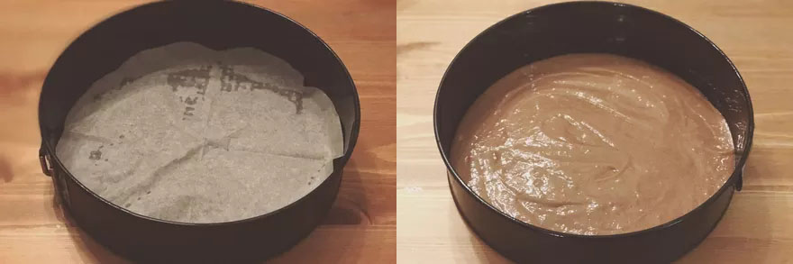 Formę wyłóż papierem do pieczenia, wysmaruj masłem i wlej do niej przygotowane ciasto.