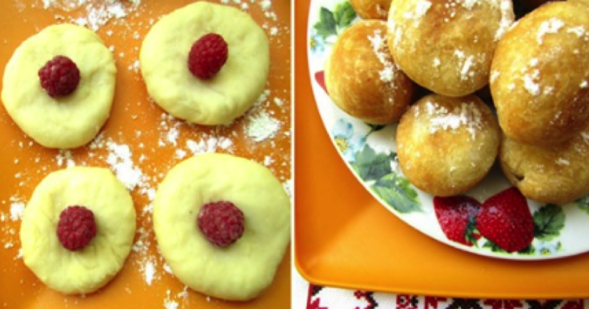 Gotowe ciasto zroluj w wałek i pokrój na kawałki. Z każdego kawałka, uformuj płaskie krążki i na środku każdego, ułóż porcję malin. Teraz zawiń brzegi i uformuj zgrabną kulkę.