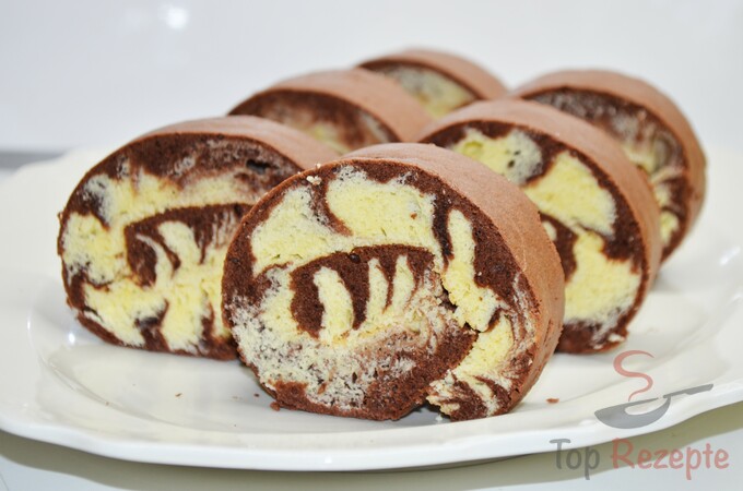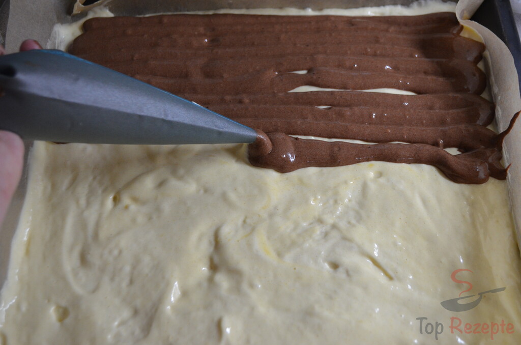 Wlej połowę ciasta na blachę wyłożoną pergaminem. Do drugiej połowy dodaj kakao i wodę. Ciasto kakaowe włożyć do worka do szprycowania i ostrożnie nałożyć na jasne ciasto.