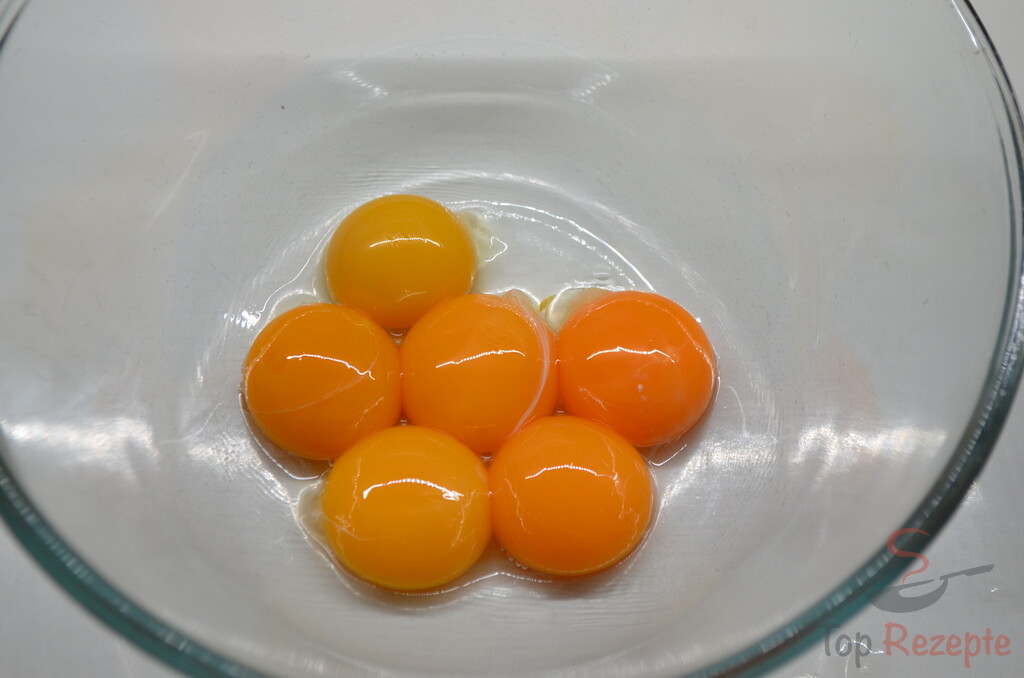 Wymieszaj żółtka z drugą połową cukru do uzyskania piany.