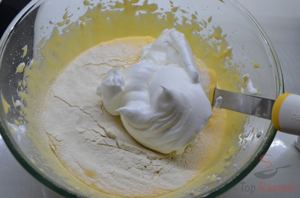 Dodaj olej do mieszanki z żółtkami i wymieszaj. Stopniowo dodawaj przesianą mąkę i białka jajek.