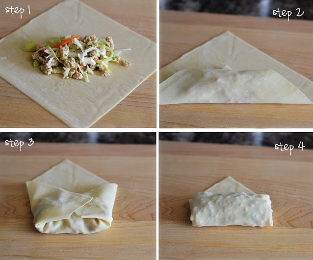 Aby przygotować tę pyszną przekąskę, musisz najpierw zająć się farszem. Zmieloną pierś z kurczaka podsmaż na patelni na małym ogniu i dodaj do niego czosnek oraz imbir. Gdy kurczak się zarumieni, dodaj do niego cebulę, kapustę oraz marchewkę – wszystkie składniki muszą być oczywiście posiekane. Taką mieszankę smaż przez kolejne 5 minut.