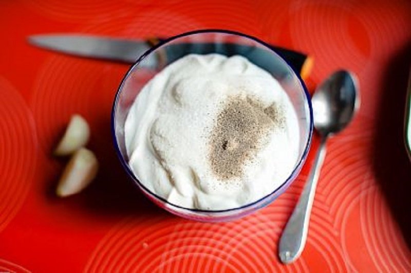 Pokrój ogórki w drobną kostkę, posiekaj koperek. Połącz majonez z jogurtem, pieprzem i czosnkiem przeciśniętym przez prasę.