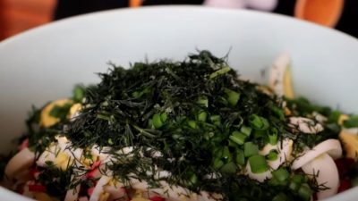 Spróbuj niezwykłej sałatki ze świeżej rzodkiewki z paluszkami krabowymi pełnymi świeżych ziół. Można podawać jako danie główne ze świeżymi wypiekami lub jako lekką przystawkę.