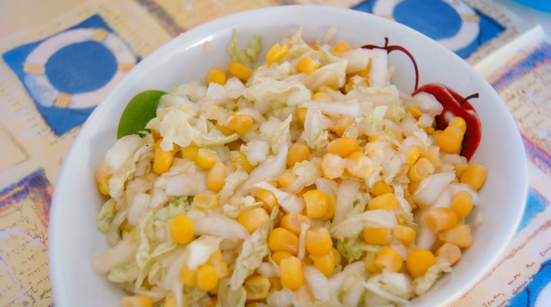 Cienko posiekać 200 g młodej kapusty. Pokroić w paski 1 jabłko. Dodać 2-3 łyżki kukurydzy. Skropić sałatkę olejem słonecznikowym i octem jabłkowym. Do smaku przyprawić solą i pieprzem.