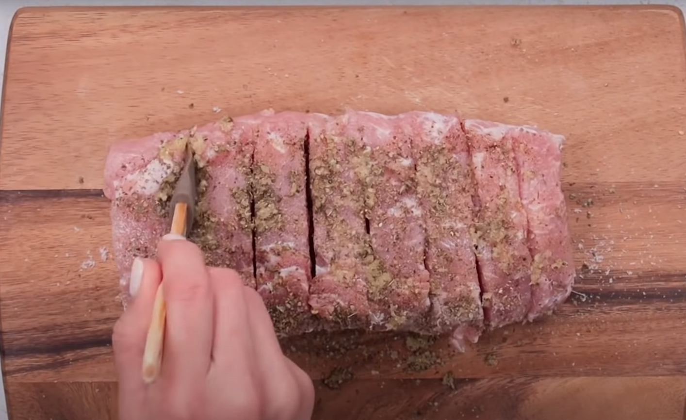 Krok 1: Kilogramowy kawałek schabu natnij wzdłuż całej długości – tylko nie przecinaj do końca! Mięso natrzyj solą, pieprzem, majerankiem i przeciśniętym przez praskę czosnkiem.