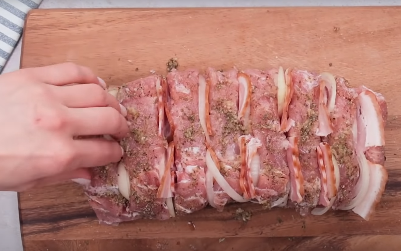 Krok 3: Do każdego nacięcia w schabie włóż kawałki cebuli i plasterki boczku. Następnie mięso przełóż do naczynia żaroodpornego.