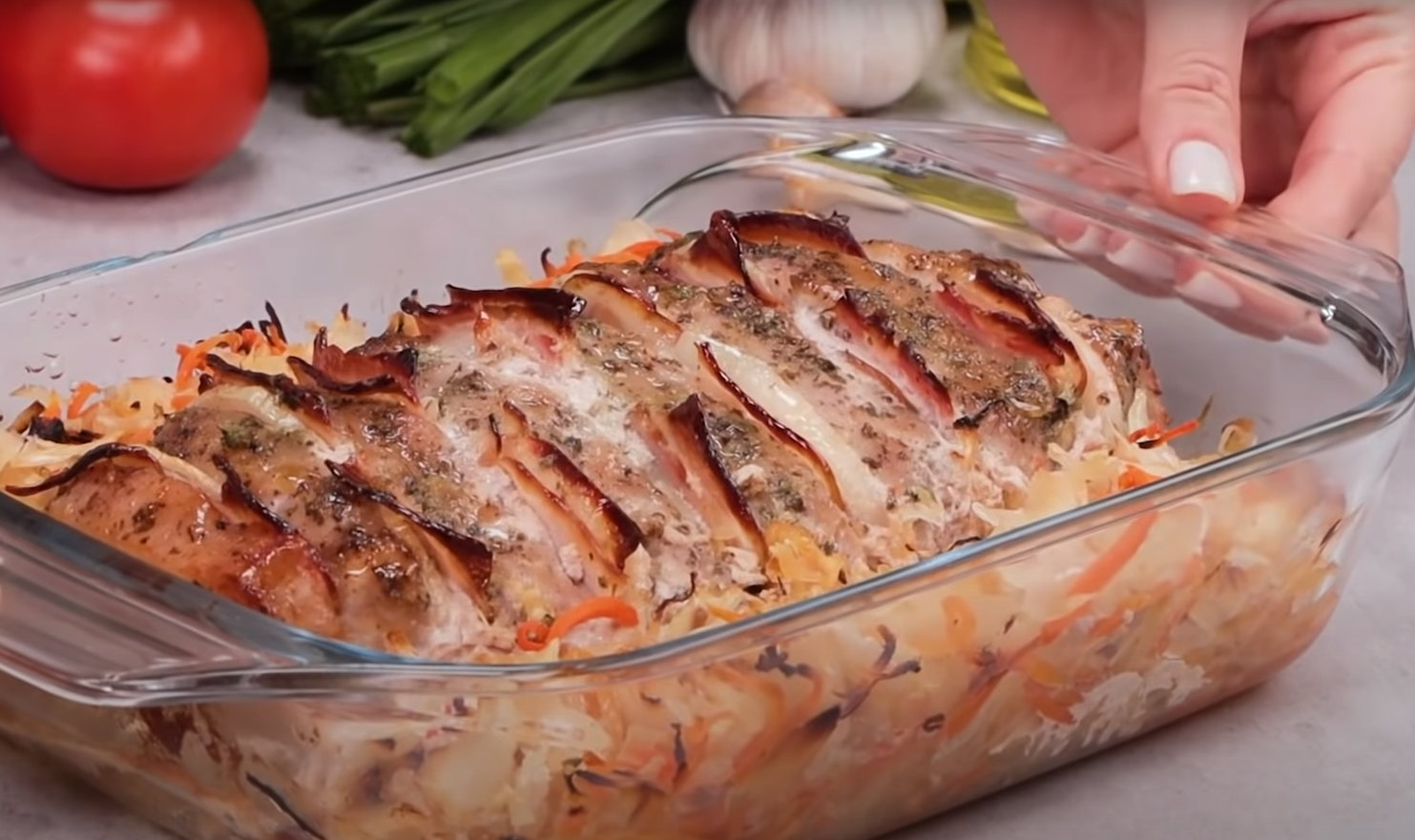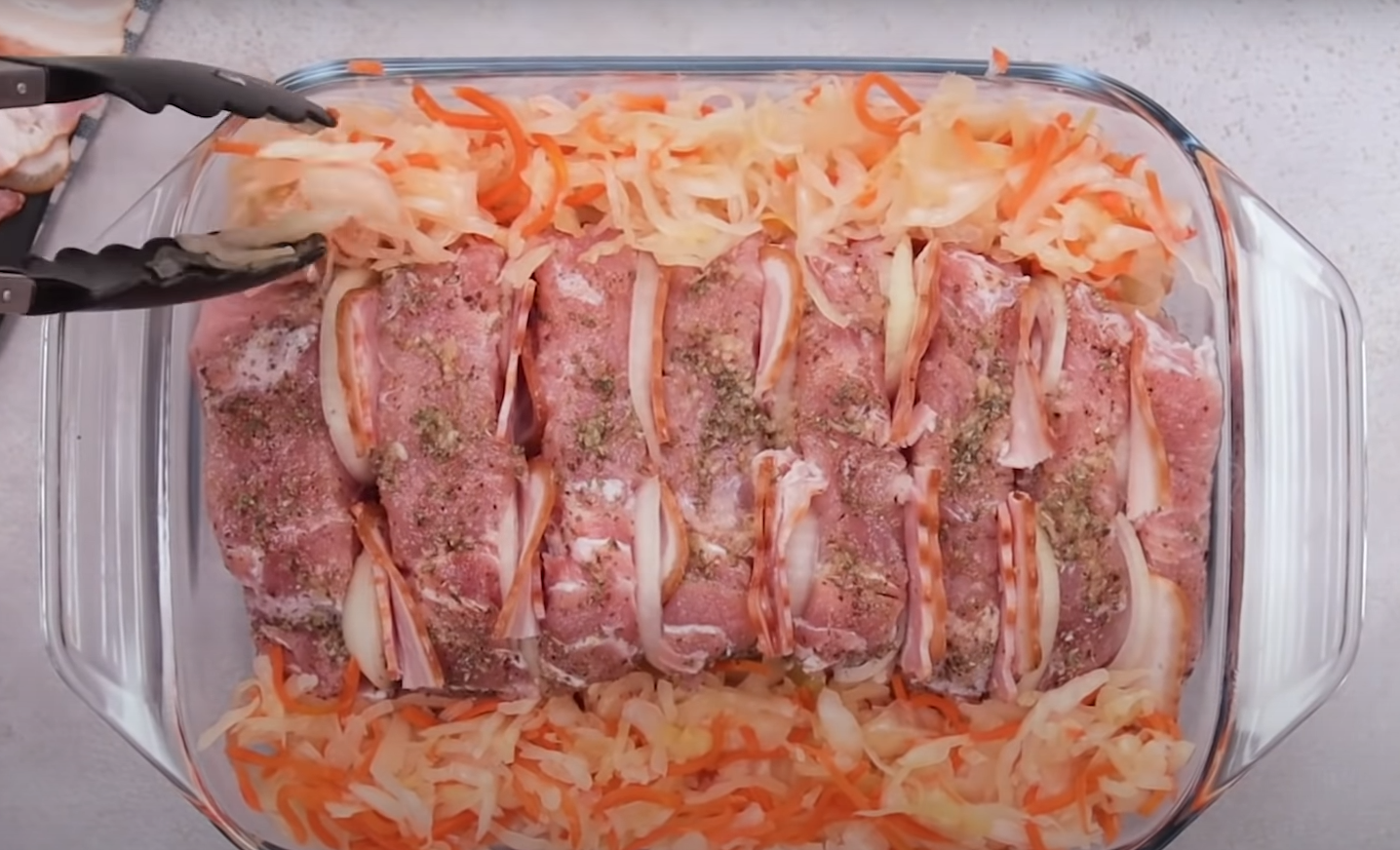 Krok 4: Jeśli wybrałeś kapustę kiszoną, ułóż ją dookoła mięsa w naczyniu. Jeżeli wolisz ogórki kiszone, pokrój je w plasterki i dodaj do cebuli oraz boczku wewnątrz nacięć.