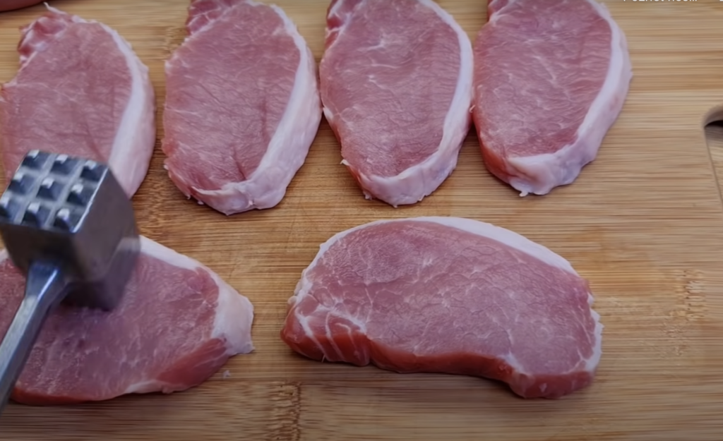 Jajka ugotować na twardo. Mięso pokroić w plastry o grubości 1 cm i delikatnie ubić tłuczkiem .