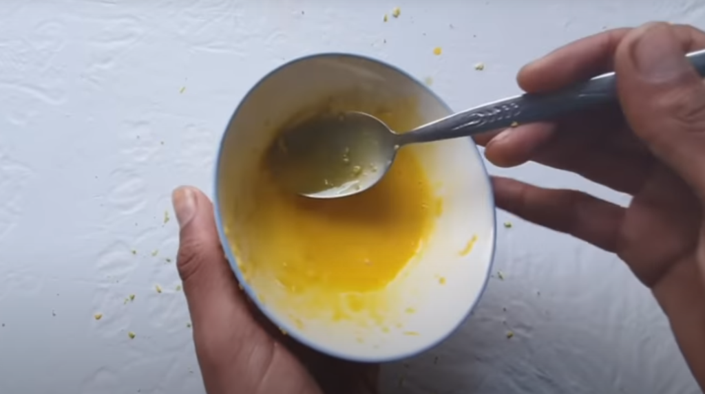 W niewielkiej miseczce ubij jajko za pomocą widelca. Następnie zajmij się cytryną – zetrzyj skórkę, a do osobnej szklanki wyciśnij sok. Czas na łączenie składników. Odmierz 2 łyżki stołowe soku z cytryny i łyżkę startej skórki. Do mieszanki dodaj 3 łyżki stołowe wcześniej ubitego jajka i 3 krople witaminy E.