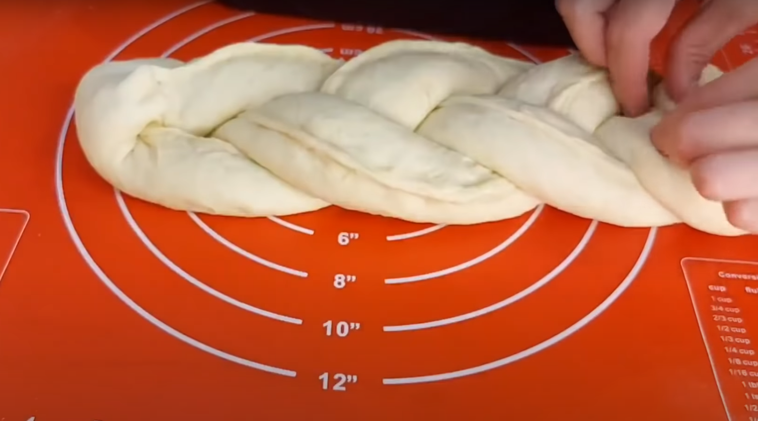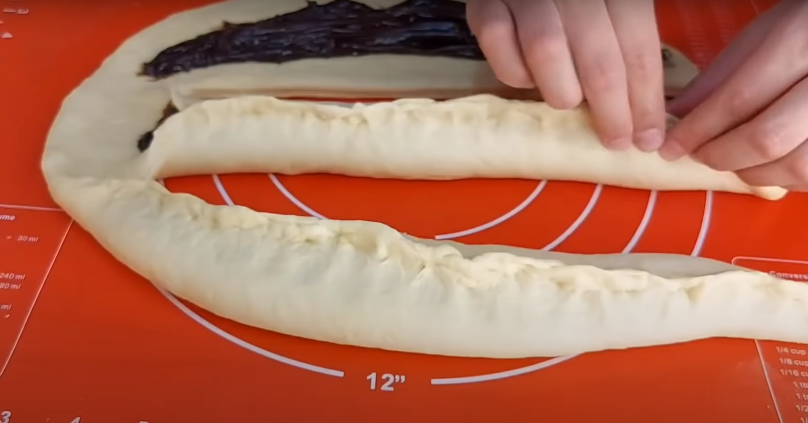 Przykryj je woreczkiem i bawełnianą ściereczką, odstaw na 10 minut. Następnie rozwałkuj ciasto i pokrój w taki sposób, aby otrzymać trzy paski ( nie przecinaj ciasta do końca). Na każdym z nich rozprowadź ulubione nadzienie np. dżem, czekoladę, orzechy czy owoce.