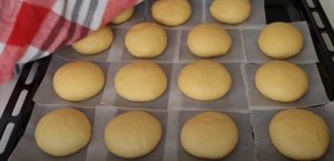 Po wyrośnięciu ciasto jeszcze trochę przerabiać. Przełożyć na wałek do ciasta, ale nie oprószać mąką, bo później się spali. Ciasto podzielić na 15 części i uformować małe bułeczki. Każdą ułożyć na kwadracie papieru do pieczenia. Pozostawić odstępy między bułeczkami, przykryć i odstawić do wyrośnięcia na 45 minut.