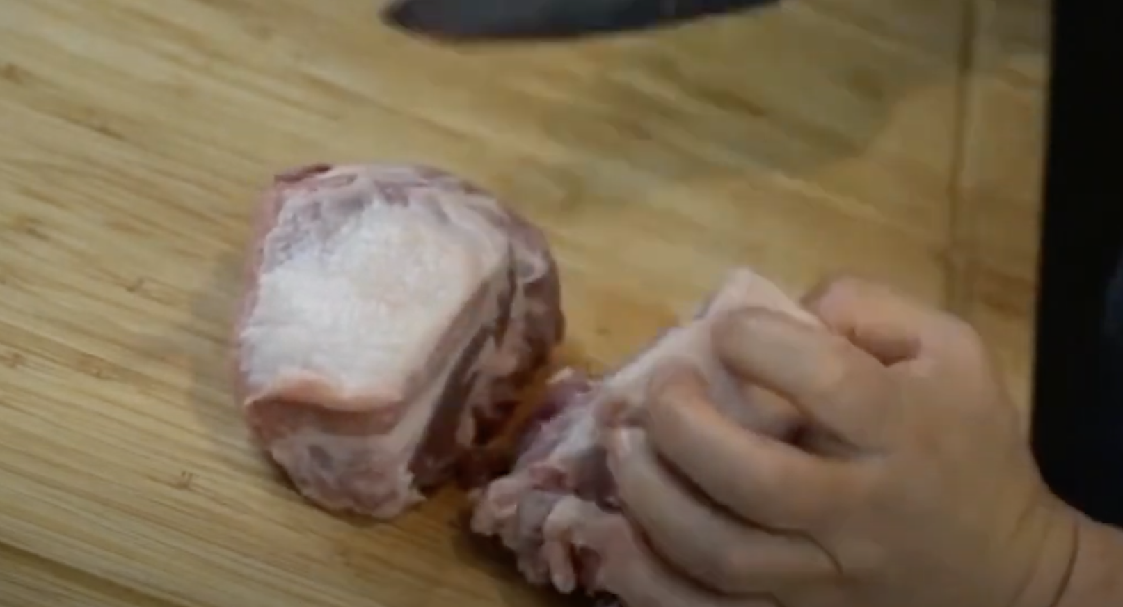 Przygotujemy mięso – możesz zrobić kawałki z wołowiny, wieprzowiny lub indyka. Ja użyłam kawałków wieprzowiny, pokroiłam je na 6 równych plastrów.