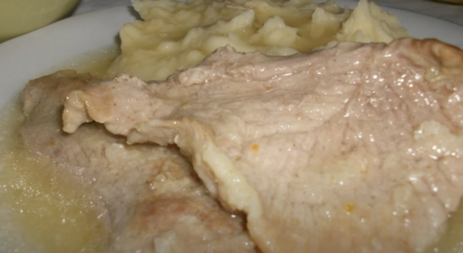 Mięso obtoczyć w mące z obu stron. Rozgrzać olej na patelni i smażyć po kilka minut z każdej strony – usmażyć mostek tak, aby mięso było wyciągnięte. Pieczone mięso przekładamy na talerz. W razie potrzeby można odcedzić olej, na którym smażone jest mięso, będziemy go potrzebować w dalszej części przepisu.
