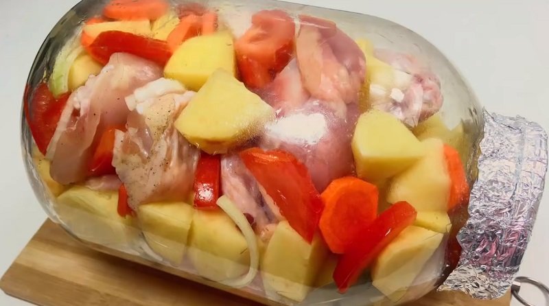 Włóż słoik do zimnego piekarnika, a następnie włącz go. Piecz w temperaturze 180 stopni przez 1,5 godziny. Kurczak z warzywami w słoiku jest gotowy! Mięso z kurczaka jest wielokrotnie smaczniejsze i bardziej soczyste niż  tradycyjnie pieczonego.