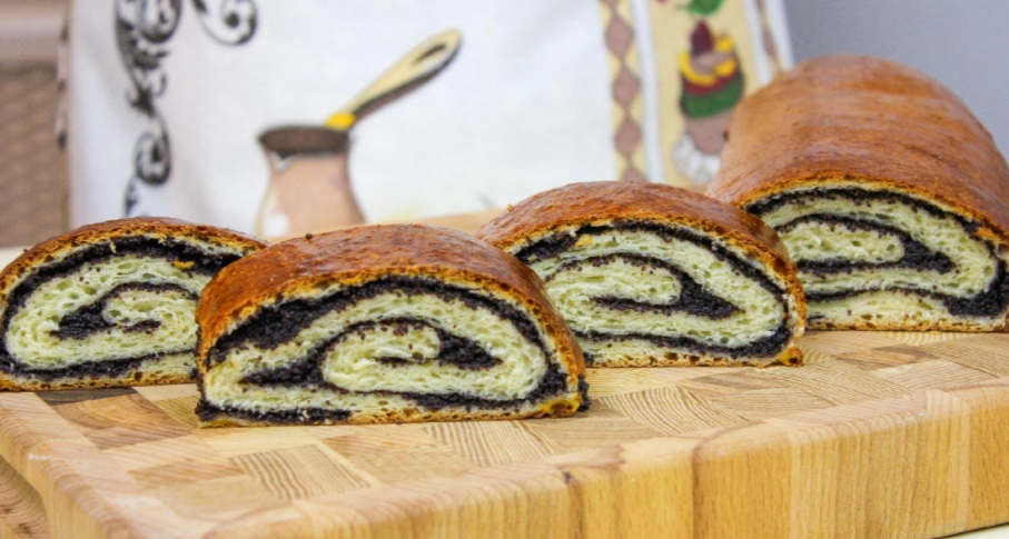 Wyłóż zakwas na posypany mąką blat. Podziel go na równe 4 części i każdą z nich rozwałkuj w kształt prostokąta o grubości około 3 mm. Przygotowane przez Ciebie nadzienie makowe rozłóż równo po cieście i zroluj. Ciasto połóż na blasze wyłożonej papierem do pieczenia, a górę ciasta posmaruj odrobiną oleju.