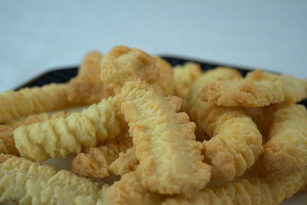 Teraz dociskamy ciasto do blachy do pieczenia tak, aby powstały równomiernie długie ciastka. Pieczemy w piekarniku nagrzanym do 180°C przez około 10-15 minut.
