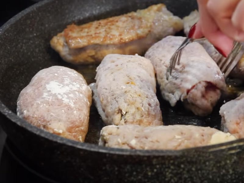 Po wyznaczonym czasie wyjmij i mięso, i cebulę. Na kawałek mięsa połóż zamarynowaną cebulę, całość zwiń w roladkę. Powtarzaj tą czynność z każdym kawałkiem. Tak przygotowane zrazy obtocz w mące i wraz z taką panierką smaż na patelni, aż uzyskają one złoty kolor. Nie pozbywaj się pozostałej mąki, będzie ona potem potrzebna! Po upieczeniu rolady przełóż na przygotowany dla nich talerz.