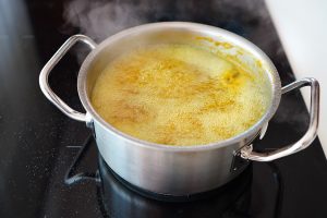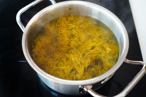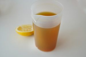 Dokładnie przecedzony płyn umieszczamy w garnku. Dosypujemy cukier i dokładnie mieszamy całość. Następnie dolewamy też wyciśnięty sok z cytryny. Syrop należy gotować na małym ogniu do momentu, aż zgęstnieje. W sytuacji, gdy na powierzchni pojawi się piana, należy zebrać ją łyżeczką i usunąć.