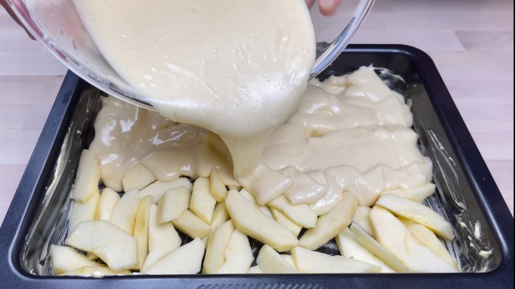 Rozłóż plasterki jabłka na blaszce i zalej ciastem. Piecz przez 30 do 35 minut w 170°C.