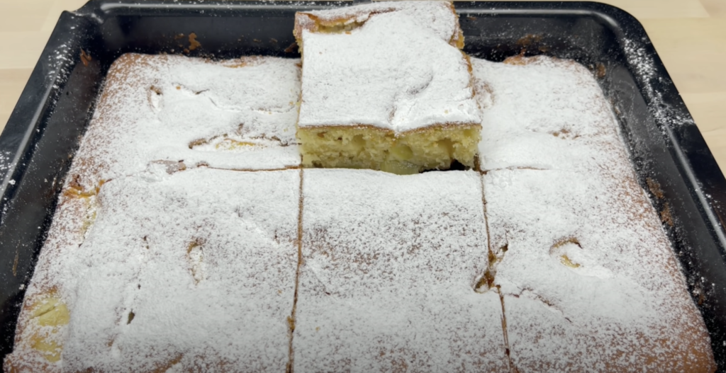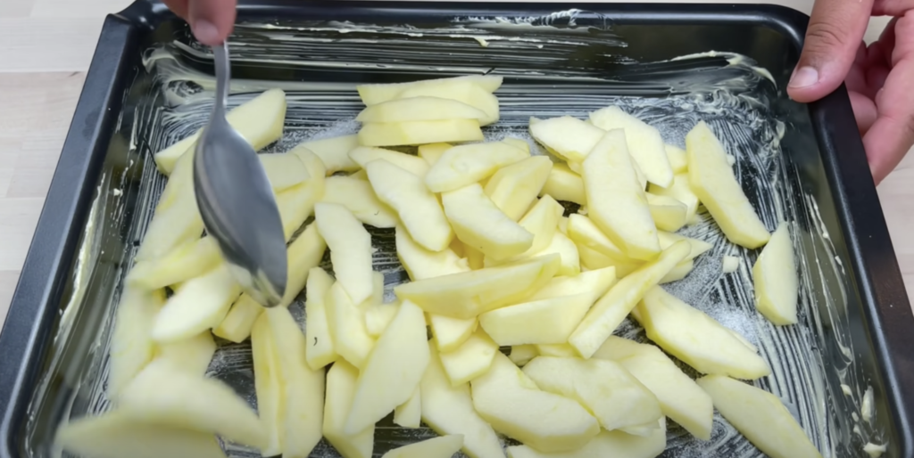 Na koniec do ciasta przesiej mąkę z proszkiem do pieczenia, dodaj szczyptę soli i wymieszaj na jednolite ciasto. Blachę o wymiarach 24×32 cm posmaruj warstwą masła i posyp cukrem – dzięki temu jabłka będą się karmelizować podczas pieczenia, a ciasto nabierze delikatnego karmelowego smaku.