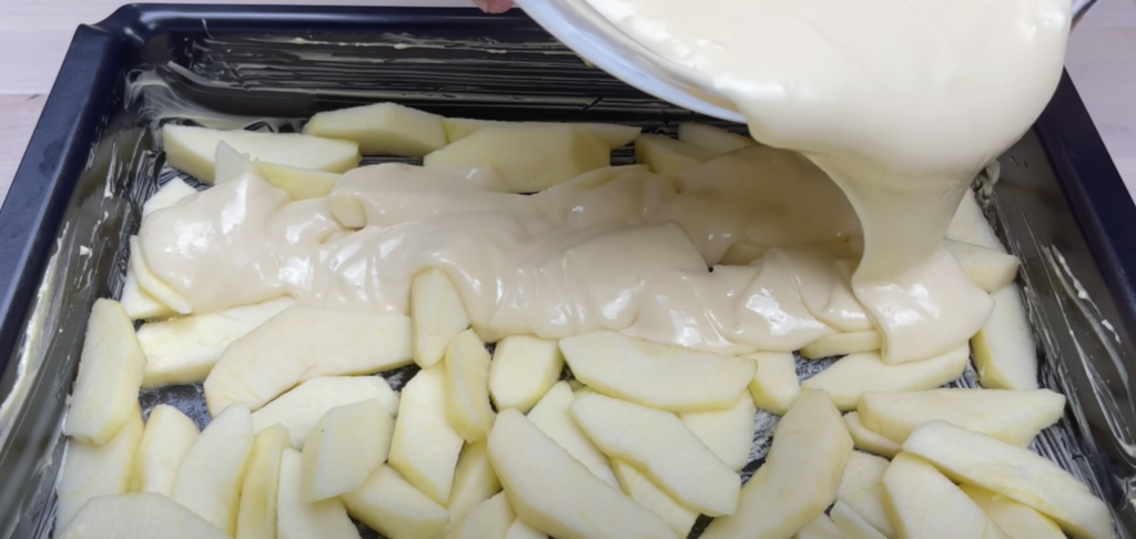 Rozłóż plasterki jabłka na blaszce i zalej ciastem. Piecz przez 30 do 35 minut w 170°C.