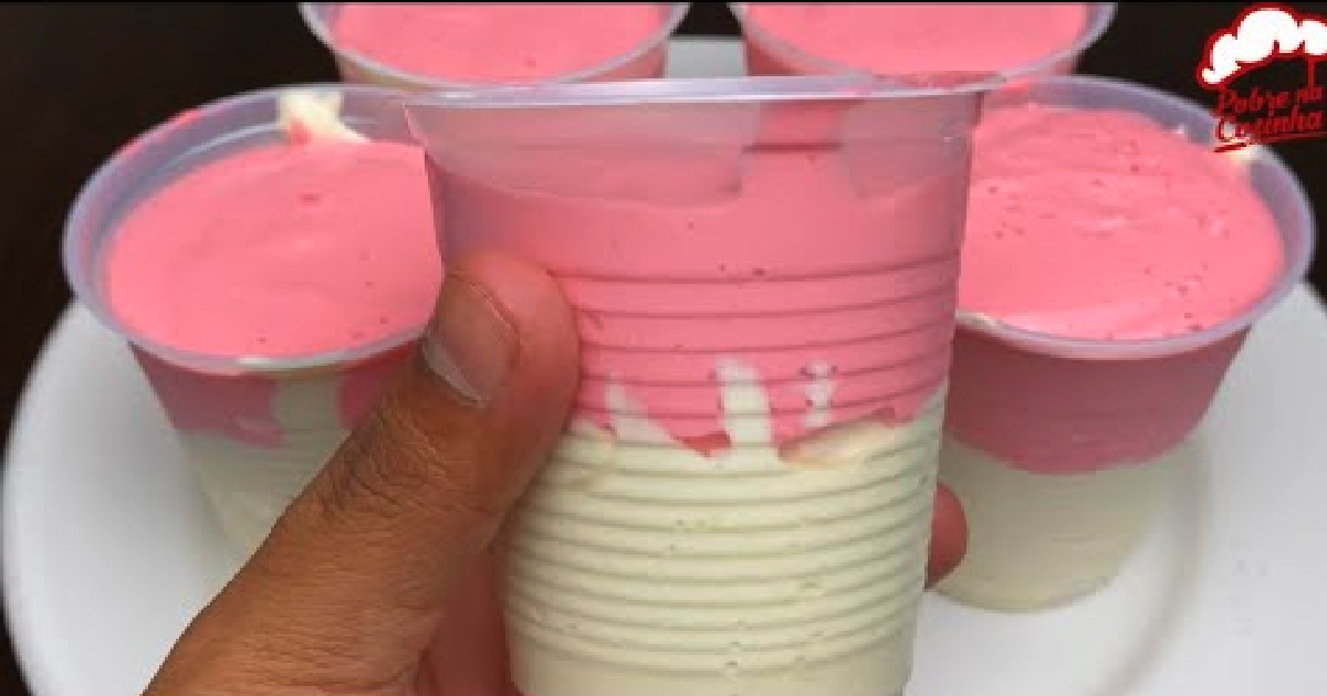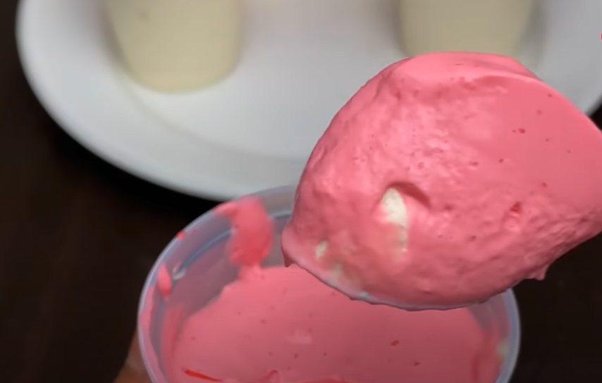 Wybierz naczynie, w którym chcesz podać deser. Na dnie naczynia rozprowadź warstwę śmietany z sokiem ananasowym. Następnie dodaj warstwę śmietany z sokiem truskawkowym. Powtarzaj, aż zużyjesz całą śmietanę. Wstaw deser do lodówki na co najmniej 30 minut, aby dobrze się schłodził i wszystkie smaki się przegryzły.