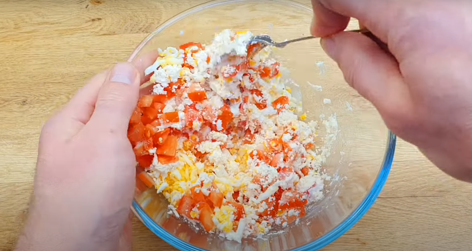 Przełożyć mięso do miski, dodać sól, pieprz, zioła, wymieszać. Ugotowane na twardo jajka zetrzeć na tarce o grubych oczkach. Zetrzeć również ser. Umyty pomidor należy pokroić na małe kawałki i dorzucić do miski z serem i jajkami. Dodać majonez i wszystko razem wymieszać.