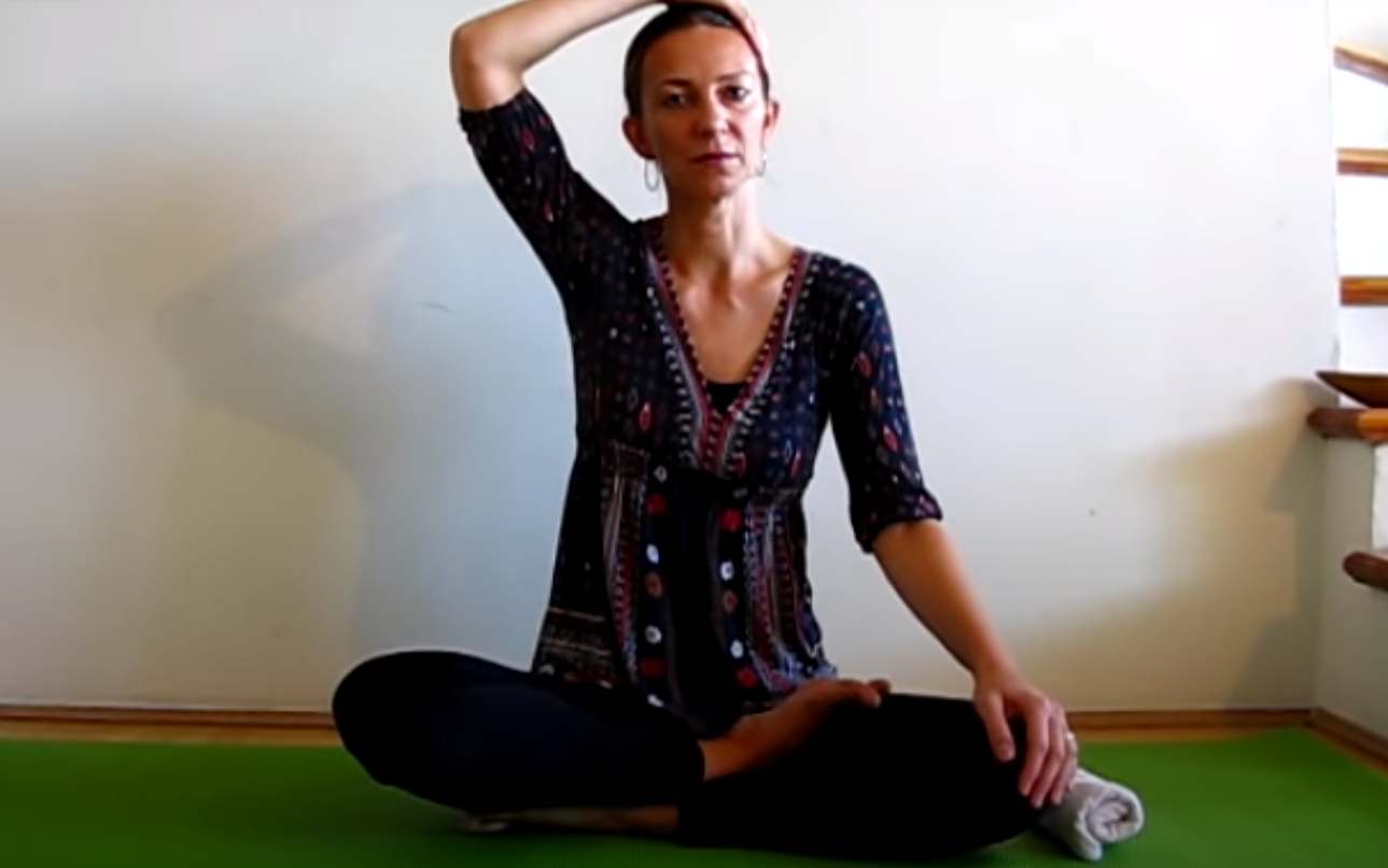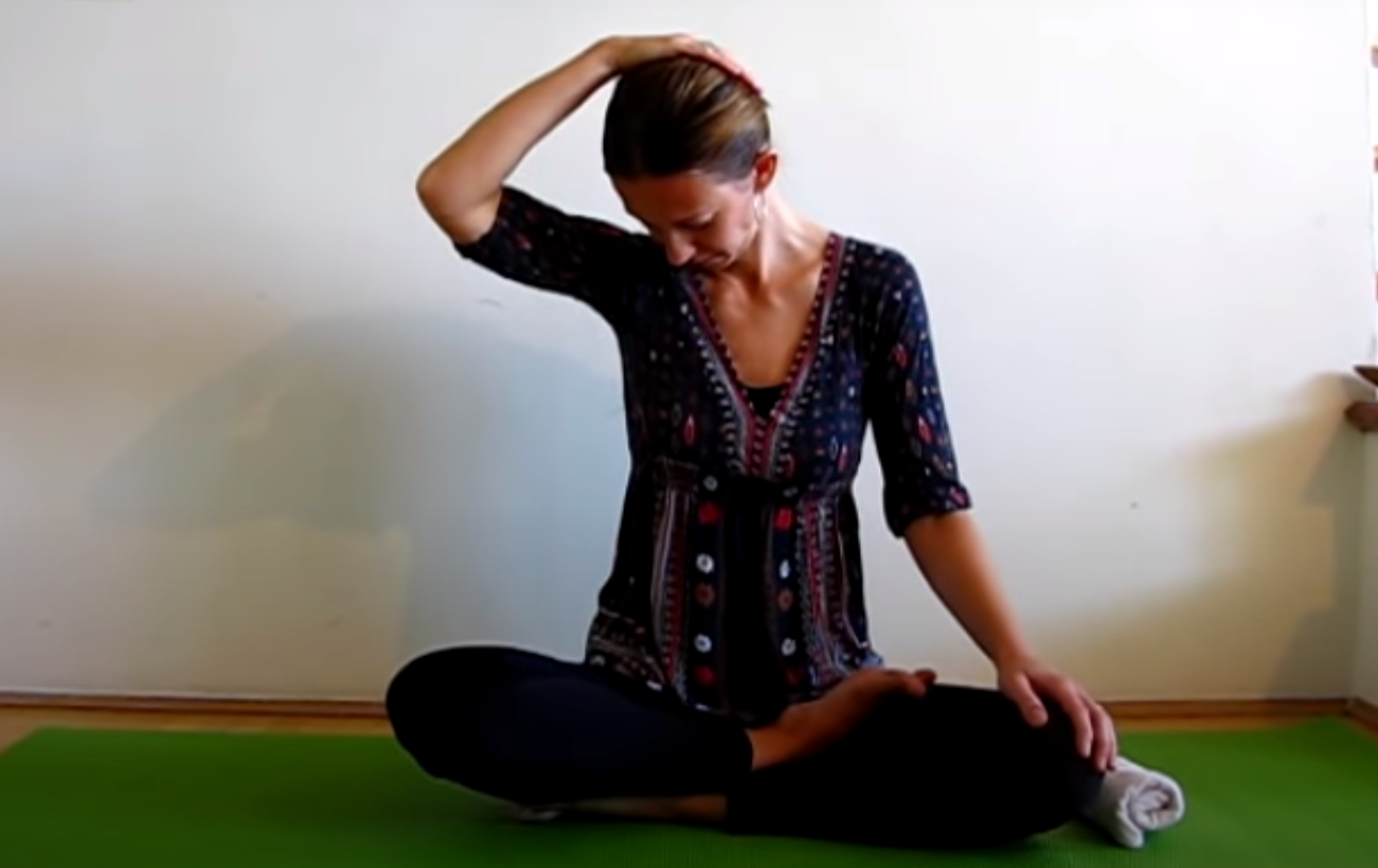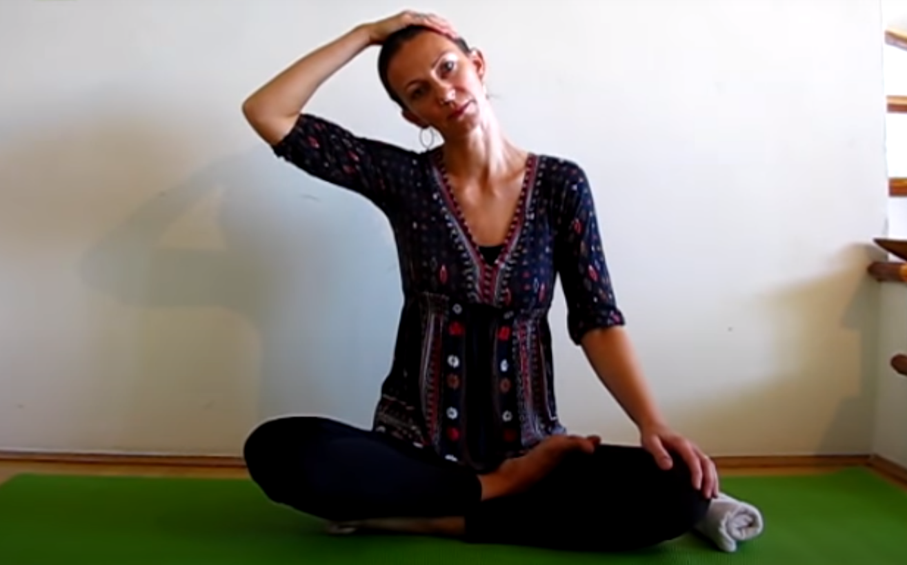 Dalej siedząc po turecku, unieś jedną rękę i połóż dłoń na skroni znajdującej się po przeciwnej stronie. Weź pięć głębokich oddechów, po czym przechyl głowę w prawą stronę. Wraz z kolejnym wydechem weź głowę do tyłu, a następnie znów do przodu.