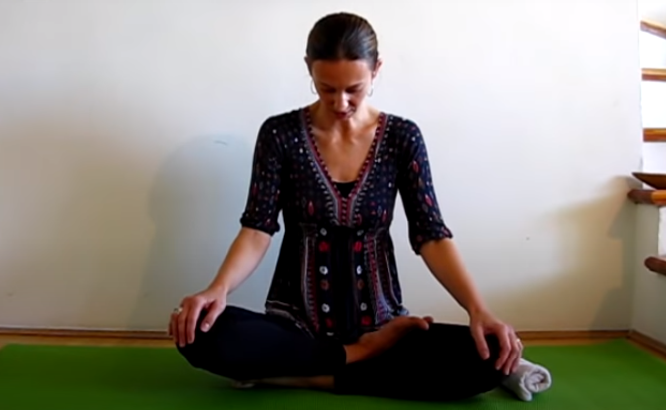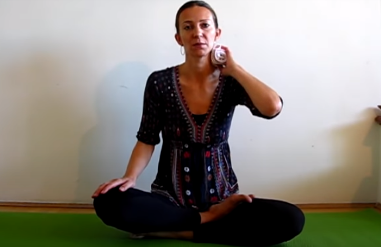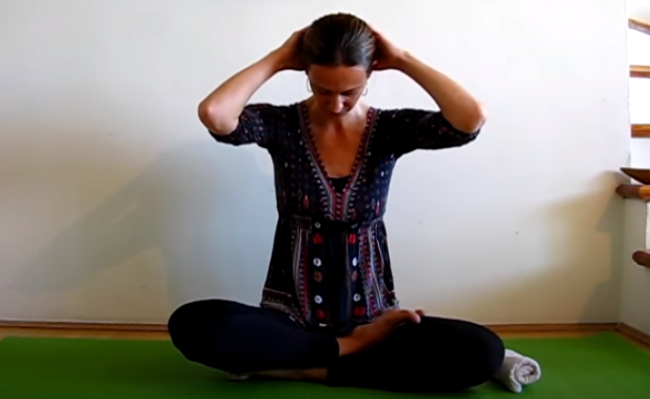 Dalej siedząc po turecku, unieś jedną rękę i połóż dłoń na skroni znajdującej się po przeciwnej stronie. Weź pięć głębokich oddechów, po czym przechyl głowę w prawą stronę. Wraz z kolejnym wydechem weź głowę do tyłu, a następnie znów do przodu.