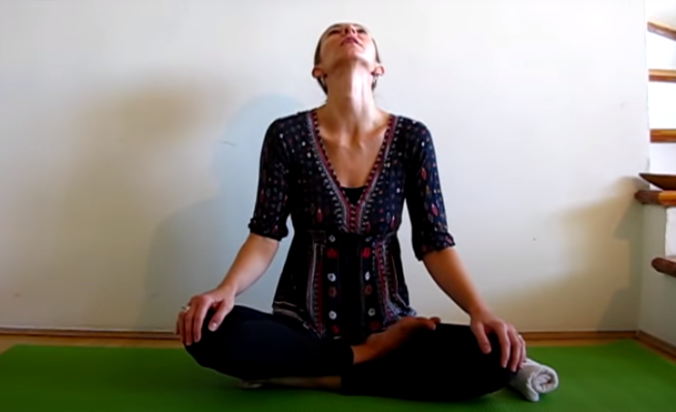 Siadając wyprostowanym w siadzie skrzyżnym, z dłoniami opartymi na kolanach, na wdechu odchyl głowę do tyłu najdalej jak tylko potrafisz. Z kolei na wydechu pochylaj głowę do przodu. Czynność tę powtórz od 5 do 10 razy.