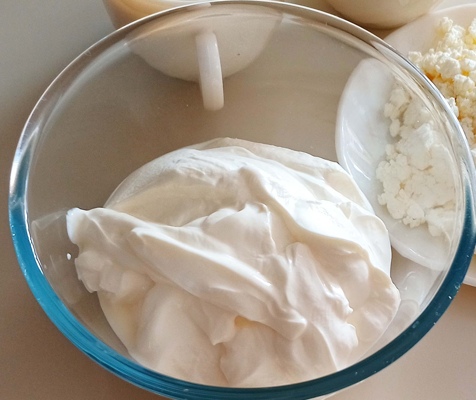 Białka do warzyw w misce wmieszaj. Do żółtek sól, pieprz, olej, musztardę oraz śmietanę dodaj. Wymieszaj.