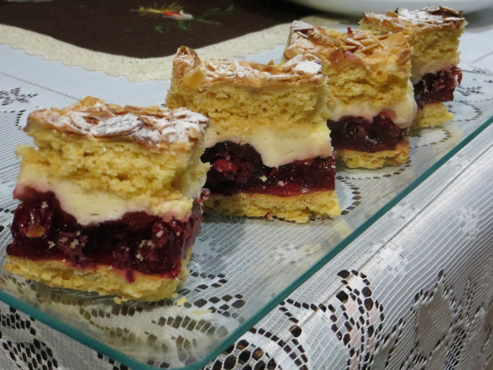 Idealne smakowo połączenie kruchego ciasta z kwaskowatą, orzeźwiającą masą wiśniową, bitą śmietaną i delikatnymi płatkami migdałowymi.