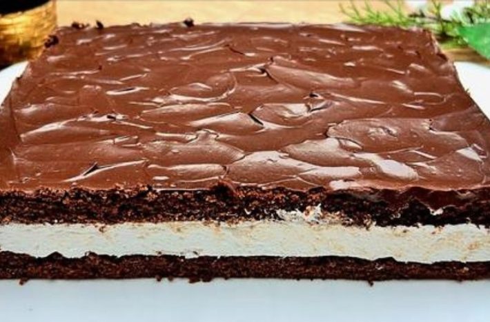 Włóż połowę korpusu do kwadratowej krawędzi ciasta. Następnie nałóż na nią krem i przykryj drugą połową ciała. Następnie rozpuść czekoladę na lukier w kąpieli wodnej. Dodaj do niego ciepłą śmietankę, wymieszaj i nałóż polewę na wierzch ciasta.