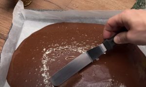 Blachę o wymiarach 34×40 cm wyłóż papierem do pieczenia i wylej na nią ciasto. Rozgrzej piekarnik do 180°C i piecz ciasto przez około 15 minut. Pozostaw do ostygnięcia, a następnie podziel na dwie równe połowy.