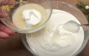 Chłodząc przygotować krem. Do sproszkowanej żelatyny dodać 50 mililitrów wody i wymieszać. Do miski wlej słodzone mleko skondensowane i śmietankę kremówkę i ubij na sztywno. Następnie do masy żelatynowej dodać około 2 łyżek śmietanki, wymieszać, wlać z powrotem do miski i ubić.