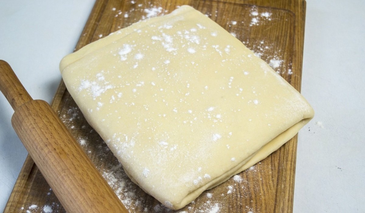 Cienko rozwałkowane pierwsze ciasto pokrywamy okruchami, składamy na pół i ponownie rozwijamy – to musimy zrobić cztery razy. Następnie ciasto dzielimy na 8 części i wyprawiamy je na trzygodzinną wycieczkę do lodówki.