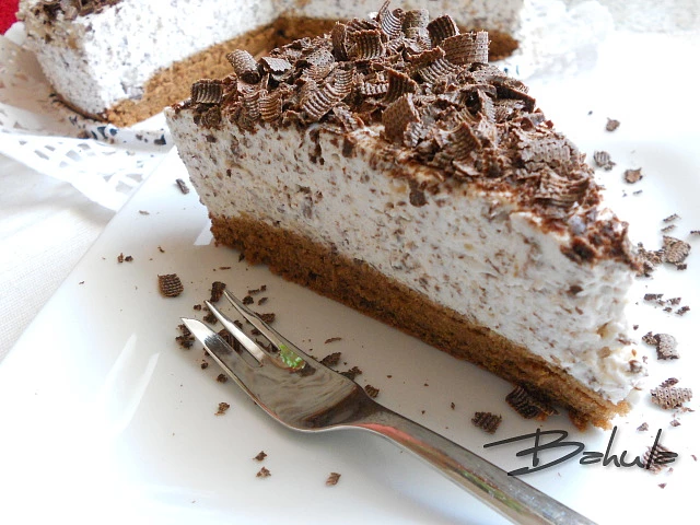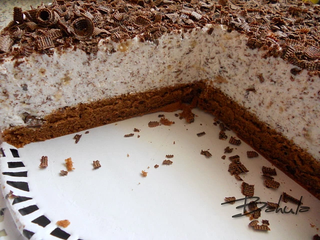 Umieść upieczoną tuszę na ruszcie do ostygnięcia. W międzyczasie ubić bitą śmietanę. Drobno zetrzyj czekoladę Margot, grubo zetrzyj czekoladę do gotowania. Wlej utwardzacz do miski, dodaj wodę i ubij trzepaczką. Do żelatyny dodać jogurt i wymieszać.