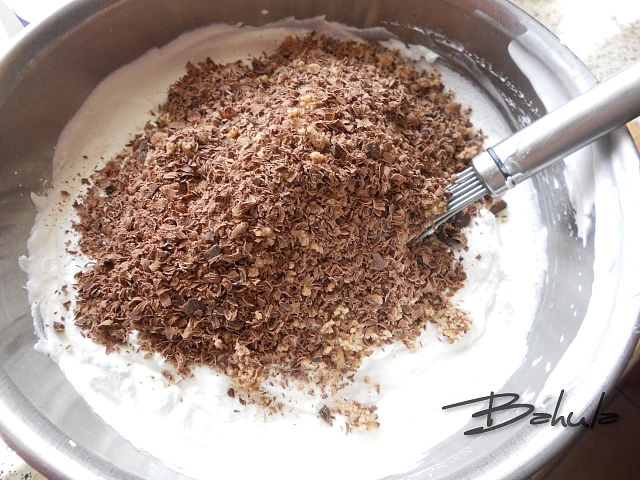 Na koniec delikatnie wmieszać ubitą śmietanę i startą czekoladę.