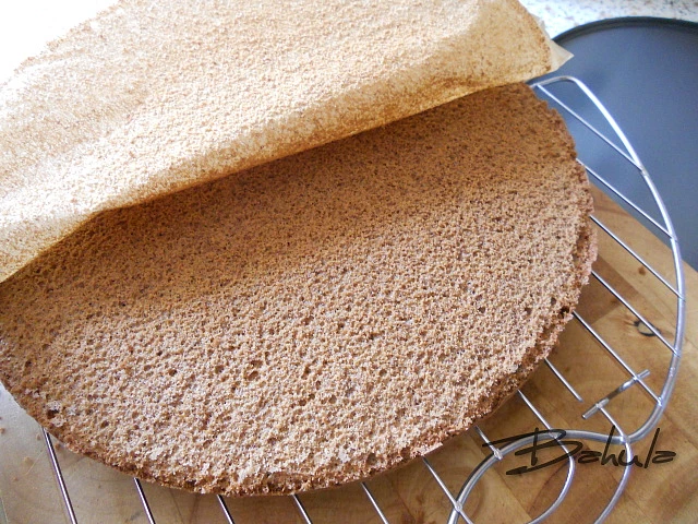 Jajka ubić z cukrem na puszystą masę, dodać olej i wymieszać. Mąkę, proszek do pieczenia i kakao wymieszać i delikatnie dodać do piany. Spód tortownicy wykładamy papierem do pieczenia, wlewamy ciasto i pieczemy.