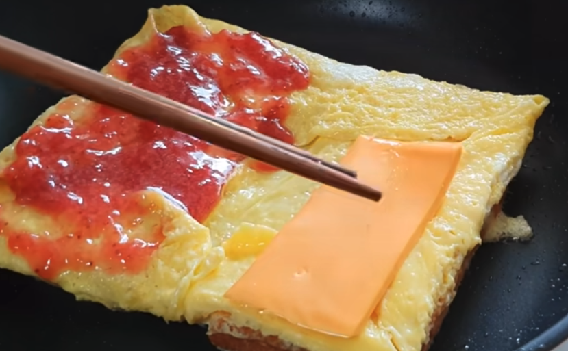 Kiedy jajka się zetną, ostrożnie odwróć całość, aby chleb był na spodzie, a jajka na wierzchu. Złóż wystające jajka na chleb, tworząc równą powierzchnię. Dodaj na jednej połowie dżem truskawkowy i ser. Złóż każdą kromkę chleba na pół, tworząc tosty z serem i dżemem w środku. Smaż tosty jeszcze chwilę, aż ser się roztopi, a chleb będzie złocisty i chrupiący.