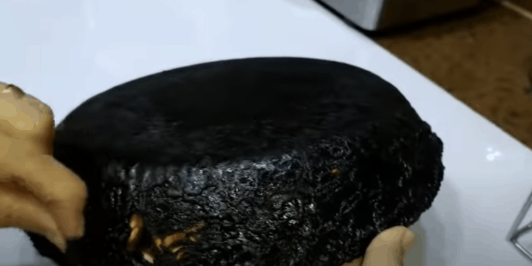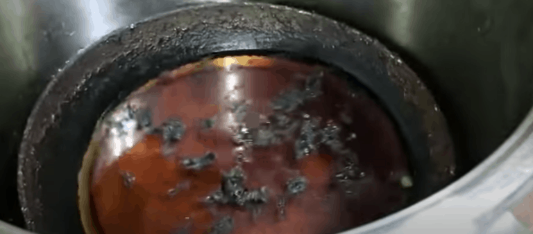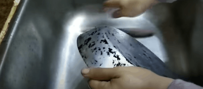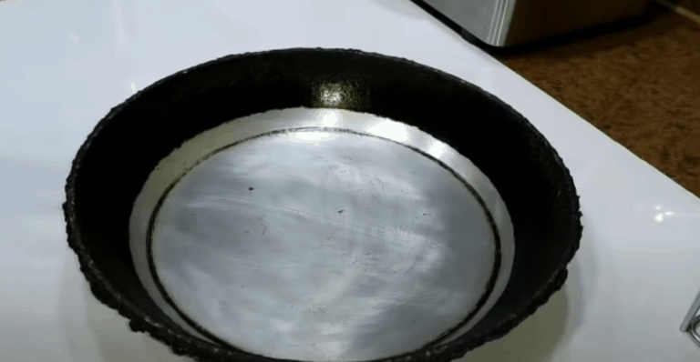 Przypalenia nawet najbardziej uporczywe znikają po kilku godzinach. Tak prezentuje się patelnia przed – jej krawędzie i powierzchnia zewnętrzna są pokryte czarnym osadem, leżała nieużywana przez lata. Z zewnątrz patelnia wyglądała tak.
