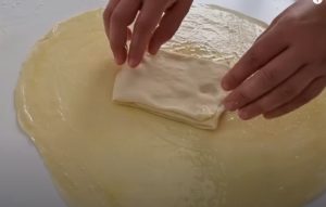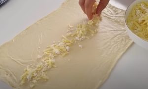 Na rolce rozwałkuj podłużny prostokątny placek z każdej pary. Posyp startym cheddarem i mieszanką fety wzdłuż środka ciasta. Następnie złóż ciasto na jednej trzeciej długości, zobacz wideo. Tak przygotowane „strudle” układamy na blasze wyłożonej papierem do pieczenia.