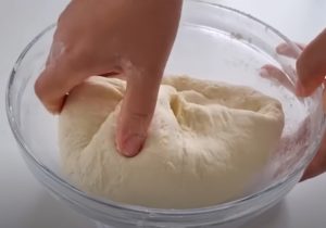 Do miski wlewamy mleko, dodajemy jogurt i proszek do pieczenia. Następnie wszystko wymieszaj. Dodaj sól i mąkę i wymieszaj ciasto. Przetwarzaj to rękami lub robotem, aby było giętkie.