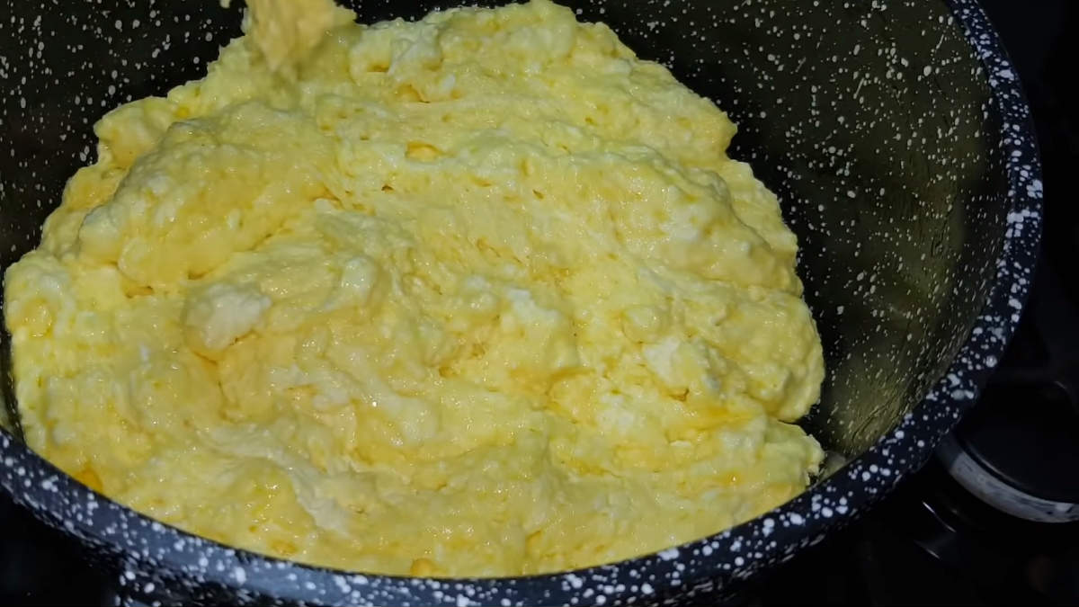 Ser odsączyć z nadmiernej ilości serwatki na durszlaku. Po czym połączyć go z masłem, solą, kurkumą oraz sodą.