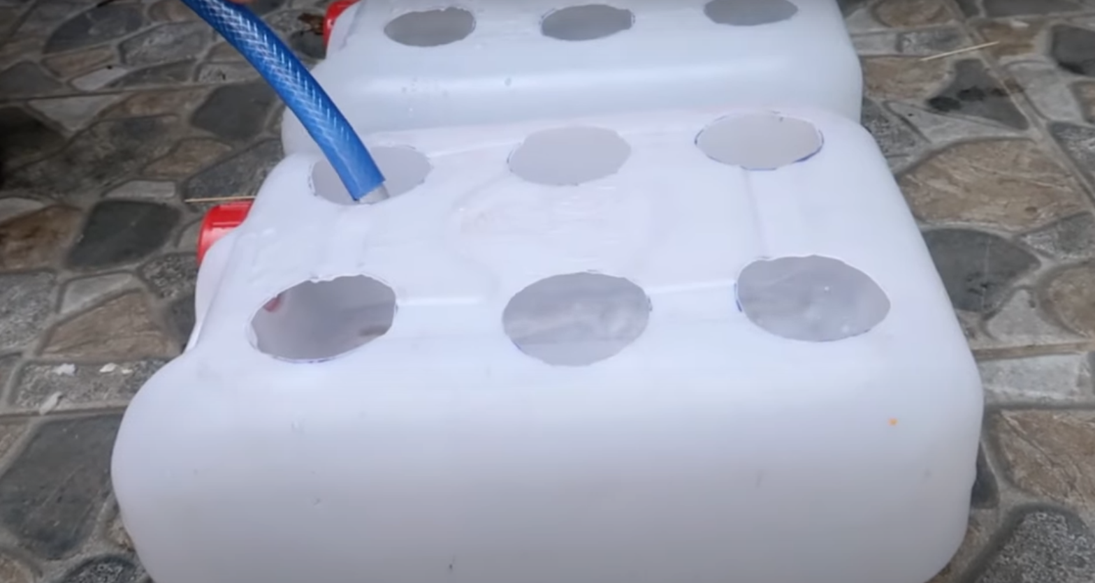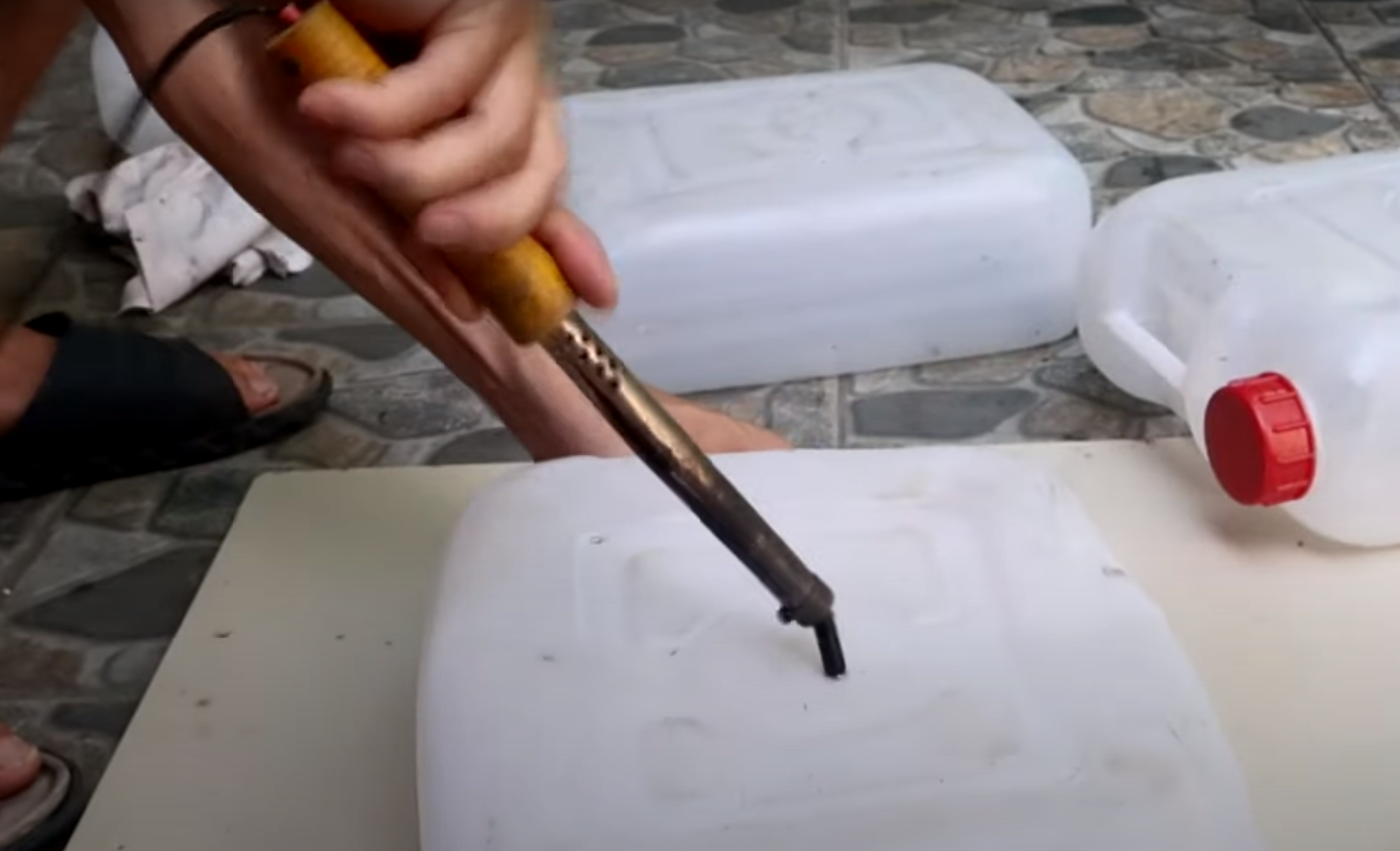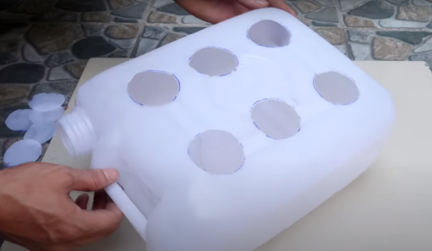 Zacznij od zaznaczenia sześciu okręgów na plastikowej butli i wycinaj je, tworząc otwory.